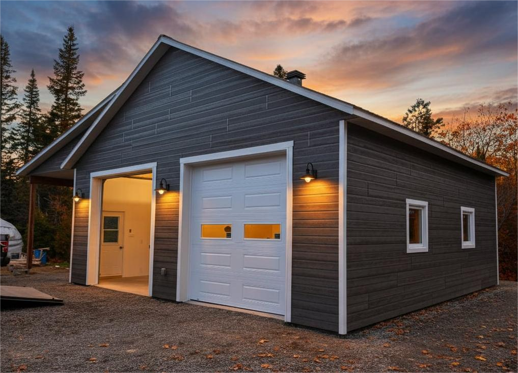 - Revêtement extérieur en fibre de bois, couleur Gris Rustique